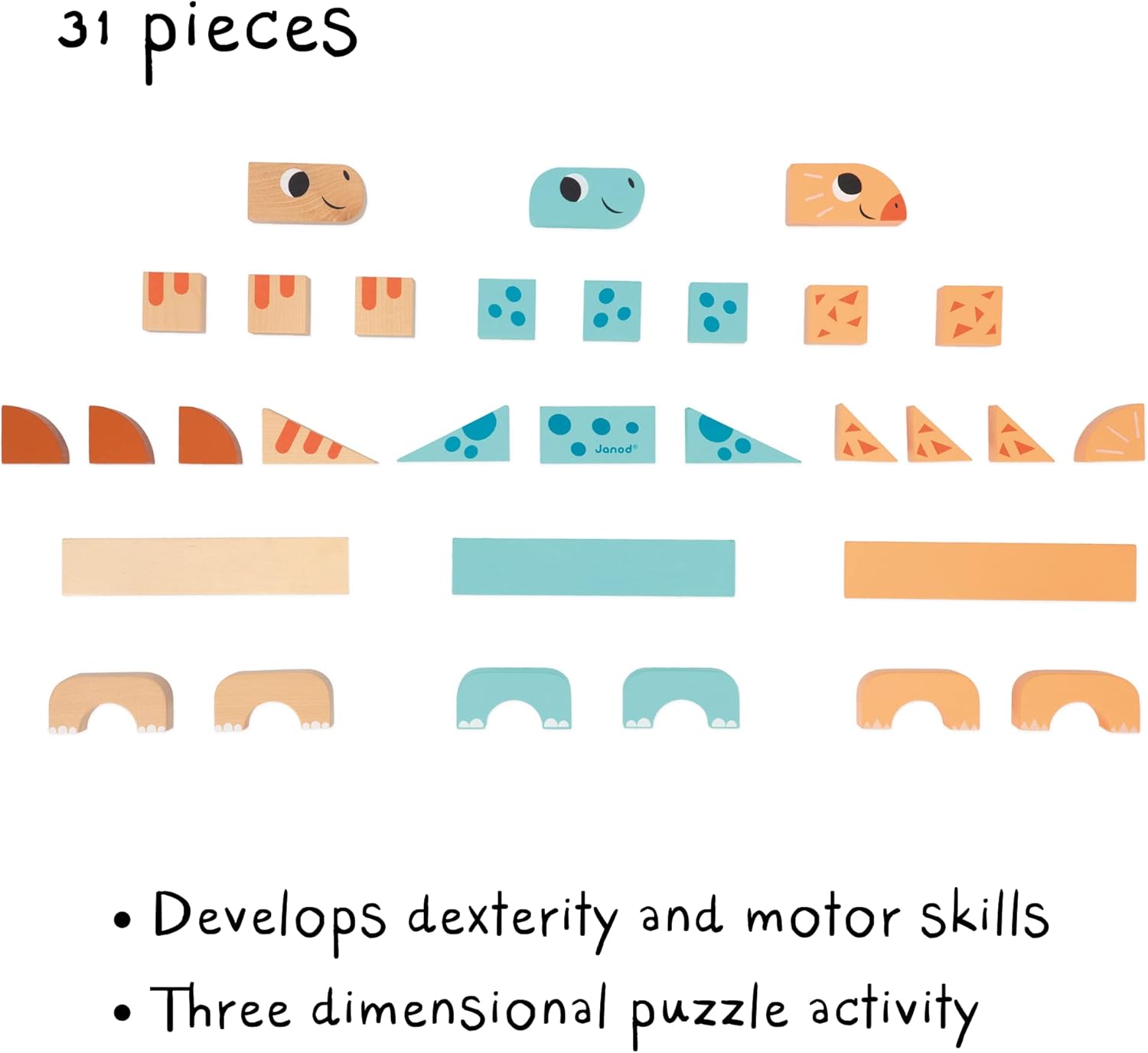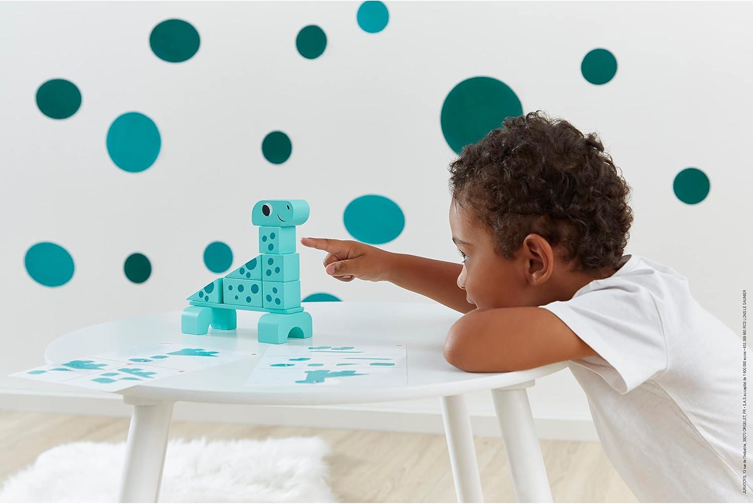 Погрузитесь в доисторические приключения с деревянным кубкидом Дино! Этот красочный и увлекательный набор из 31 детали позволяет детям создавать трёх очаровательных динозавров — трицератопса, диплодока и спинозавра — следуя простым карточкам-инструкциям.