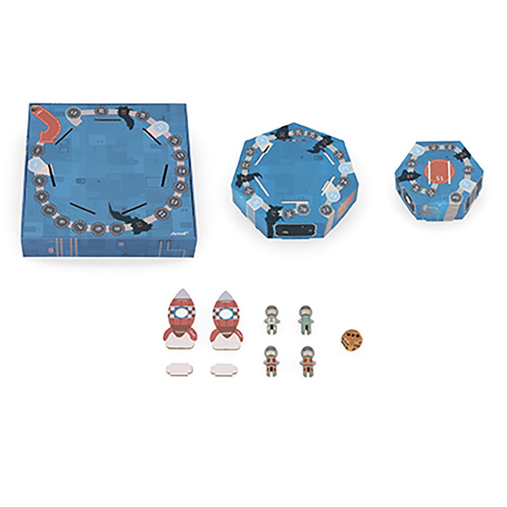 В комплект входят: 4 деревянных космонавта, картонная ракета, деревянный 3D-стержень и деревянный кубик (вишня, шпон и фанера). Рекомендуемый возраст: от 5 до 10 лет.